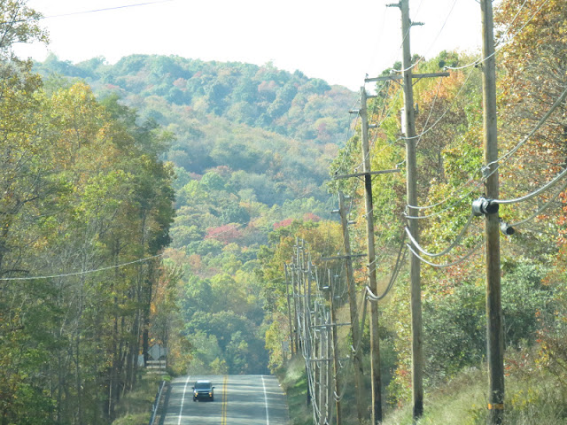 It was such a beautiful day for a drive to the Laurel Highlands in PA. The temp was 64 when we left home so I put Bobby in shorts because he was going to get a workout later. The sun was shining and the leaves were pretty. When we finally turned off the main road, Bobby was so super excited and so were Bob and I. The Nemacolin Resort golf course is beautifully landscaped. I didn't get the best pictures since we were in the car...