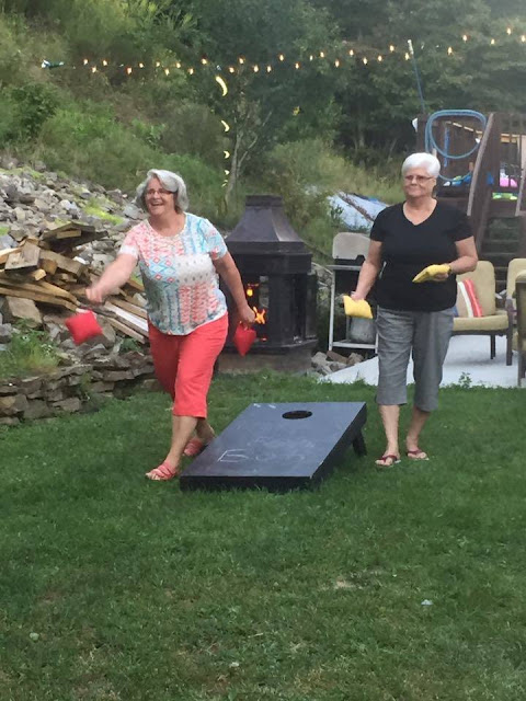 Yes, I did it, I put 50 candles on the cake and lit that puppy up!! Definitely an outdoor activity. The amount of smoke that came off of the candles would have put the smoke alarms off inside the house.We moved the dinner tables out and brought out the corn hole boards. They also turned one of the tables into a beer pong game. Watching my mom play beer pong.....worth all of the party planning effort!! Sorry I don't have any pictures of that game!